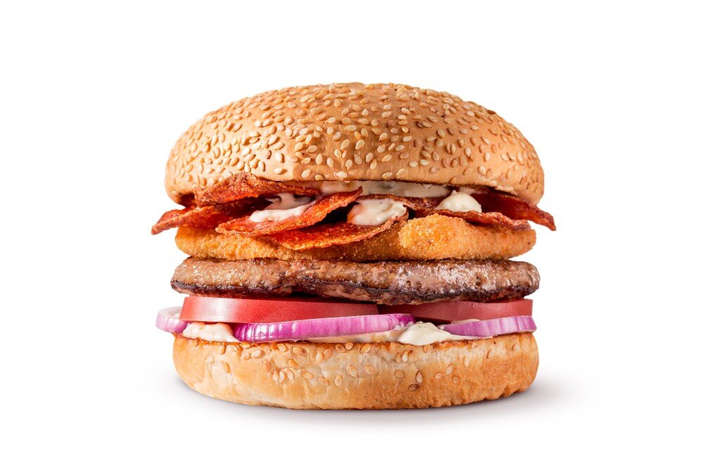 Говяжья котлета Сыр в панировке Пеперони Красный лук Свежие томаты Неаполитанский соус соус Айоли