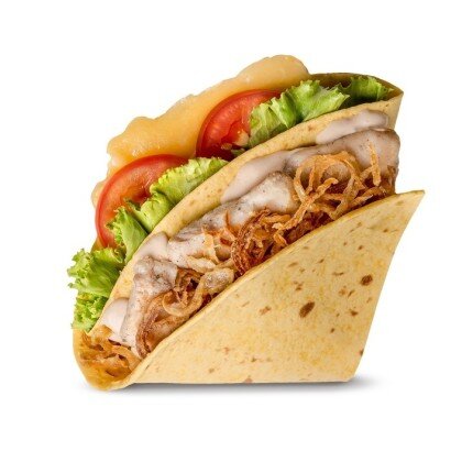 Тортилья Говяжья котлета Помидоры Салат Айсберг Сыр Лук Фри Соус от Шефа Соус Айоли