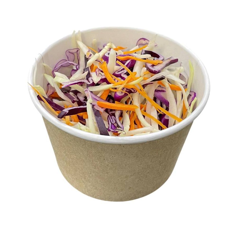 Забудьте скучные салаты! Этот Коул Слоу — настоящий взрыв красок и фактуры. Фиолетовые кружева краснокочанной капусты переплетаются с тонкими лентами белокочанной и сочной моркови, создавая на тарелке яркий вихрь. Заправка — наше секретное оружие: бархатистый майонез, в котором утонули капля выдержанного винного уксуса и острая горчица. Черный перец легкое покалывающее послевкусие. Это не просто гарнир, это самостоятельная история о хрусте и пикантности.