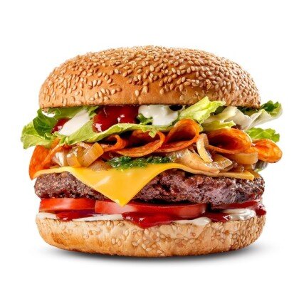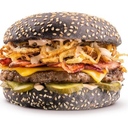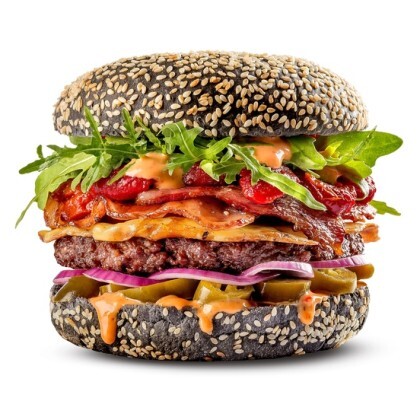 Две говяжьи котлеты/двойная порция куриного филе, двойной сыр, бекон, маринованные огурчики, красный лук, томат, Айсберг, соус Айоли, соус Смоки Сальса